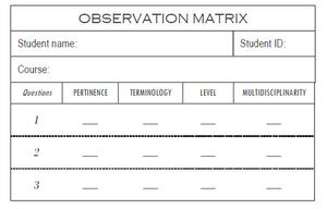 - análise e avaliação das questões realizadas pelos alunos durante a utilização de uma rede social como promoção e incentivo ao questionamento num contexto específico. Existem diversos estudos que utilizam ferramentas online, nomeadamente redes sociais para promover o questionamento dos alunos. Os autores consideram que uma forma de promover um maior número de questões, a realizar por cada aluno, é utilizando uma ferramenta online (Neri de Souza e Moreira, 2009). Desta forma, existem vários estudos que utilizam diferentes critérios para a avaliação das questões, como podemos verificar na imagem que se segue. A imagem mostra uma matriz de observação das questões realizadas, através da análise de quatro dimensões, que os autores consideraram pertinentes para o seu estudo (Canella, Ciancimino e Campos, 2010):