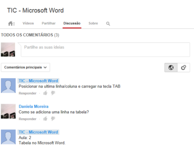 - comentários dos alunos a cada vídeo colocado nos diferentes canais dos mesmos (imagem Youtube1).