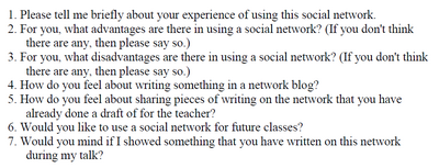 - análise das perceções dos alunos face à utilização de uma rede social – em que através de um questionário os alunos indicam as vantagens, desvantagens, limitações, sentimento relativo à partilha durante a utilização de uma rede social (Aresta, Moreira e Pedro, 2008; Balogné Bérces et al, 2011). Seguidamente pode visualizar-se uma imagem com as questões colocadas aos alunos sobre as suas experiências e opiniões acerca da utilização de uma rede social em contexto educativo: