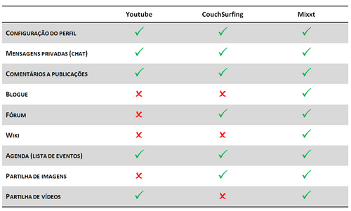 Tendo em consideração a identificação de diferentes plataformas tecnológicas de comunicação que possam ser um suporte a atividades de ensino e aprendizagem, foi feita uma análise de três redes sociais, que, por definição, têm diferentes propósitos. Assim, foi decidido analisar as seguintes redes sociais: YouTube, CouchSurfing e Mixxt.