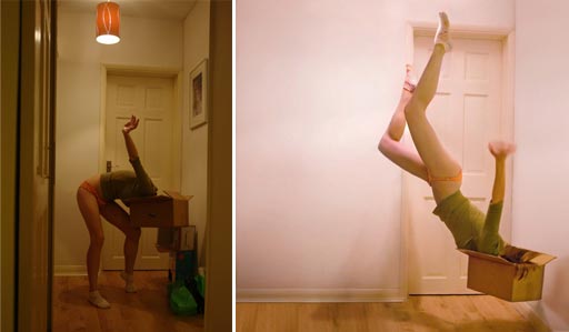Nestas ilusões as imagens são feitas a partir de uma série de fotos que depois são colocados e montadas de maneira a criar uma ilusão - de levitação, voando ou caindo, por exemplo. Existem várias maneiras para alcançar a imagem que se deseja: Pode-se simplesmente posicionar os membros em lugares diferentes para cada fotografia, como em "Sprung" (imagem à esquerda), ou pode-se usar uma ajuda para suportar o corpo numa posição e, em seguida aplicar uma máscara especial no Photoshop. Também pode-se ir um passo além e ter alguém para impulsionar para o ar. Em "The smothering" (imagem à direira), tirou uma fotografia com a cabeça dentro de uma caixa, e tirou outra fotografia com a ajuda do namorado que a impulsionou para cima.