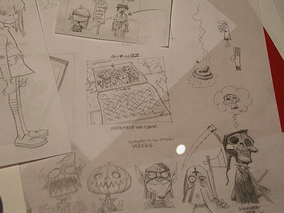| + | [[File:P10100195ul.jpg|thumb|right|400px|Esboço dos desenhos de Jamie Hewlett]] | ||