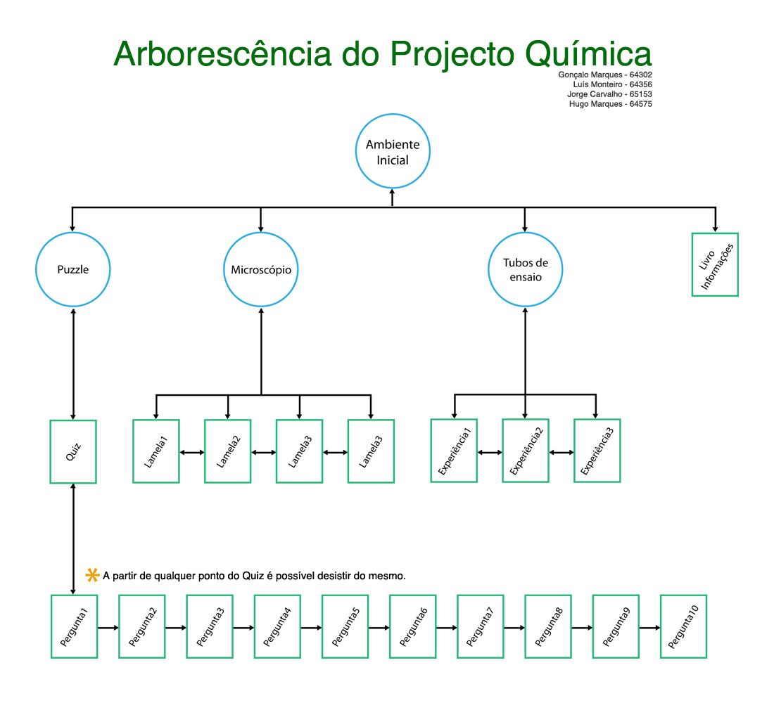 A arborescência acima apresentada é do tipo composta, começando com o Ambiente Principal, subdividindo-se em 4 nós: "Puzzle", "Microscópio", "Tubos de Ensaio" e "Livro/Informações". Cada uma destas subdivide-se em links. Esta tipologia foi escolhida uma vez que é necessária a coexistência de estruturas anteriores. O Quizz é um questionário, que se inicia obrigatoriamente na questão 1 e a partir desta é possível seguir até à questão 10. No entanto, a partir de cada questão é possível desistir e regressar ao "link" que lhe deu origem.