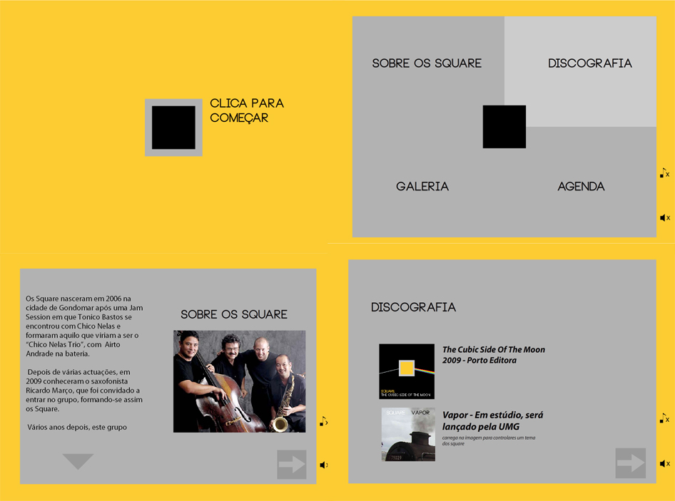 O projecto é uma aplicação multimédia interativa que serve para publicitar uma banda fictícia chamada Square. Dentro da aplicação será possível consultar conteúdo como a identidade dos Square, fotografias da banda, discografia, com possibilidade de ouvir vários temas, e uma agenda com as actuações. Tem também uma aplicação em que se pode controlar um tema da banda através de loops de som feitos no programa Cubase, englobando vários ritmos de música.