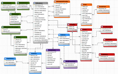 Apesar da grande complexidade Base de Dados desenvolvida, a mesma pode ser sub-dividida em cinco grupos, sendo eles relativos às festas (a vermelho), aos amigos/amizades (a verde), comentários (a roxo), ficheiros (a azul) e mensagens/posts (a laranja), tendo como elemento central a tabela referente aos Utilizadorres. Nela estarão indicados todos os dados pessoais relativos a cada utilizador registado no site.