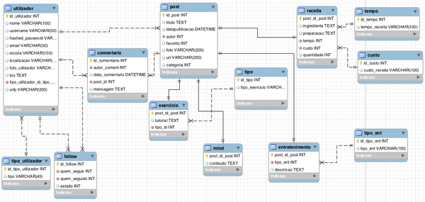 Post: cada post poderá conter um título, data de publicação, foto, um url e um autor. Cada post é feito por apenas um autor e cada autor poderá ter mais do que um post. Os campos anteriormente mencionados são comuns a todo o tipo de posts, ou seja, independentemente da categoria a que pertencem, todos os posts têm aqueles campos. No entanto, houve necessidade de criar tabelas que permitissem a especificação dos posts consoante a categoria escolhida: exercício, mind, receita e entretenimento. Por sua vez, estas tabelas poderão estar relacionadas com outras tabelas que permitam especificar ainda mais os seus componentes, é o caso do tempo e custo de uma receita, do tipo de exercício e de entretenimento. Os valores referentes a essas especificações são pré-definidos por nós e não pelo utilizador, são uma espécie de “catálogo”.