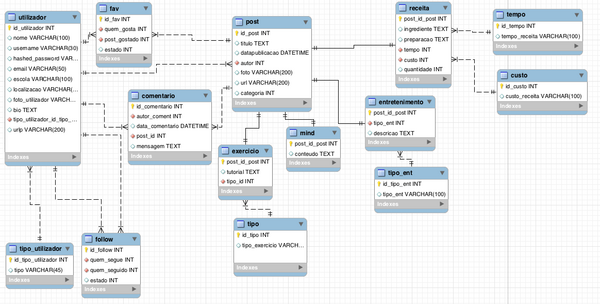 Post: cada post poderá conter um título, data de publicação, foto, um url e um autor. Cada post é feito por apenas um autor e cada autor poderá ter mais do que um post. Os campos anteriormente mencionados são comuns a todo o tipo de posts, ou seja, independentemente da categoria a que pertencem, todos os posts têm aqueles campos. No entanto, houve necessidade de criar tabelas que permitissem a especificação dos posts consoante a categoria escolhida: exercício, mind, receita e entretenimento. Por sua vez, estas tabelas poderão estar relacionadas com outras tabelas que permitam especificar ainda mais os seus componentes, é o caso do tempo e custo de uma receita, do tipo de exercício e de entretenimento. Os valores referentes a essas especificações são pré-definidos por nós e não pelo utilizador, são uma espécie de “catálogo”.